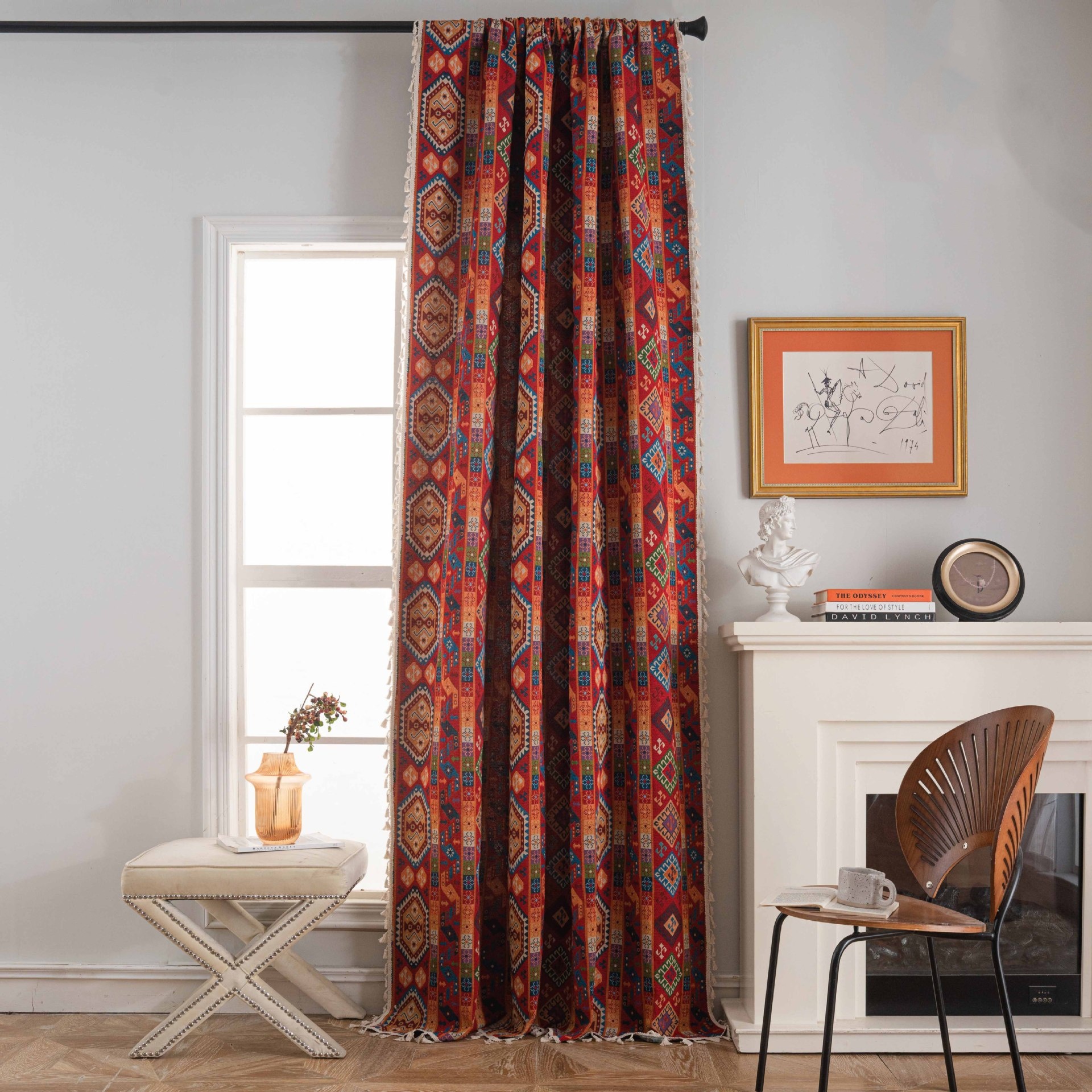 Color: A225-25 rod-through - red geometric badge + beige tassel, A223-25 rod-through - beige background with branch and bird + beige tassel, A224-25 rod-through - cashew + beige tassel